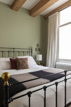 Slaapkamer met vintage oud bed, handgemaakte kussens en een warm plaid. Linnen gordijnen via Studio Pleun Interiors. www.pleun.nl