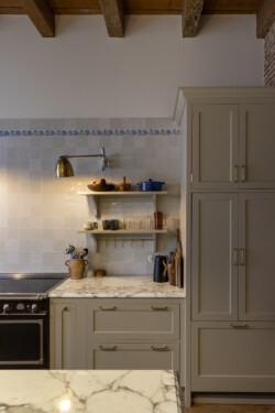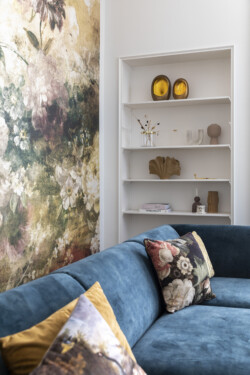 Behang, wallmural dat lijkt op een oud schilderij met een verzameling van verschillende kussens op een blauwe elementenbank. Keuken met een marmer blad en oude Friese witjes.