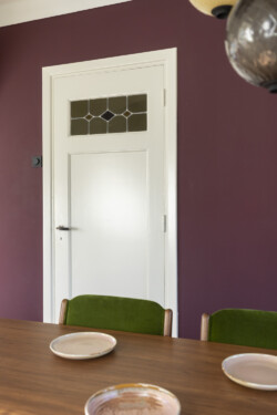 Gordijnen op maat gemaakt door Studio Pleun Interiors, vintage eetkamerstoelen opnieuw gestoffeerd in een groene velvet. Servieskast en muur in Farrow & Ball Brinjal no. 222.